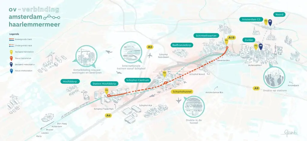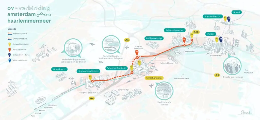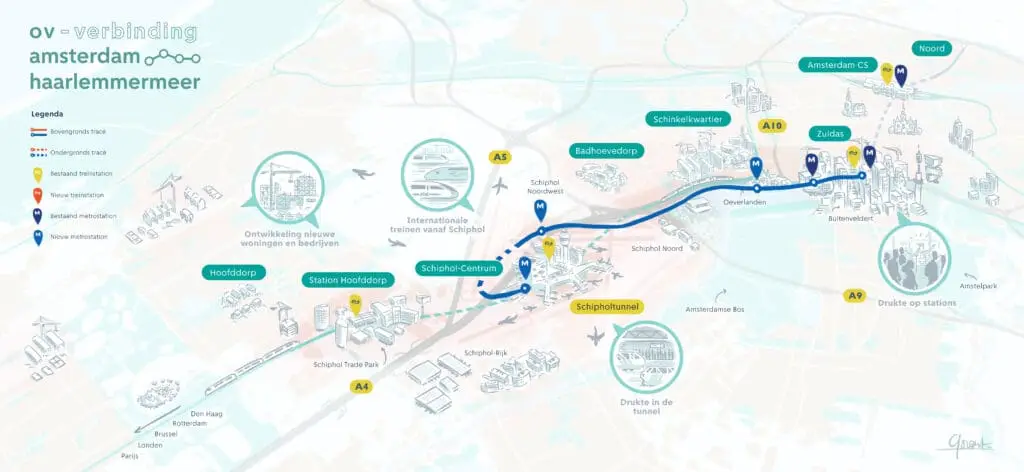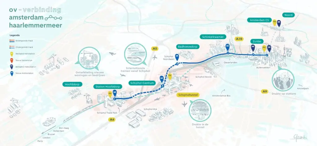OV-oplossing 4: Metro tot Schiphol. Verlenging Noord/Zuidlijn tot Schiphol grotendeels bovengronds.